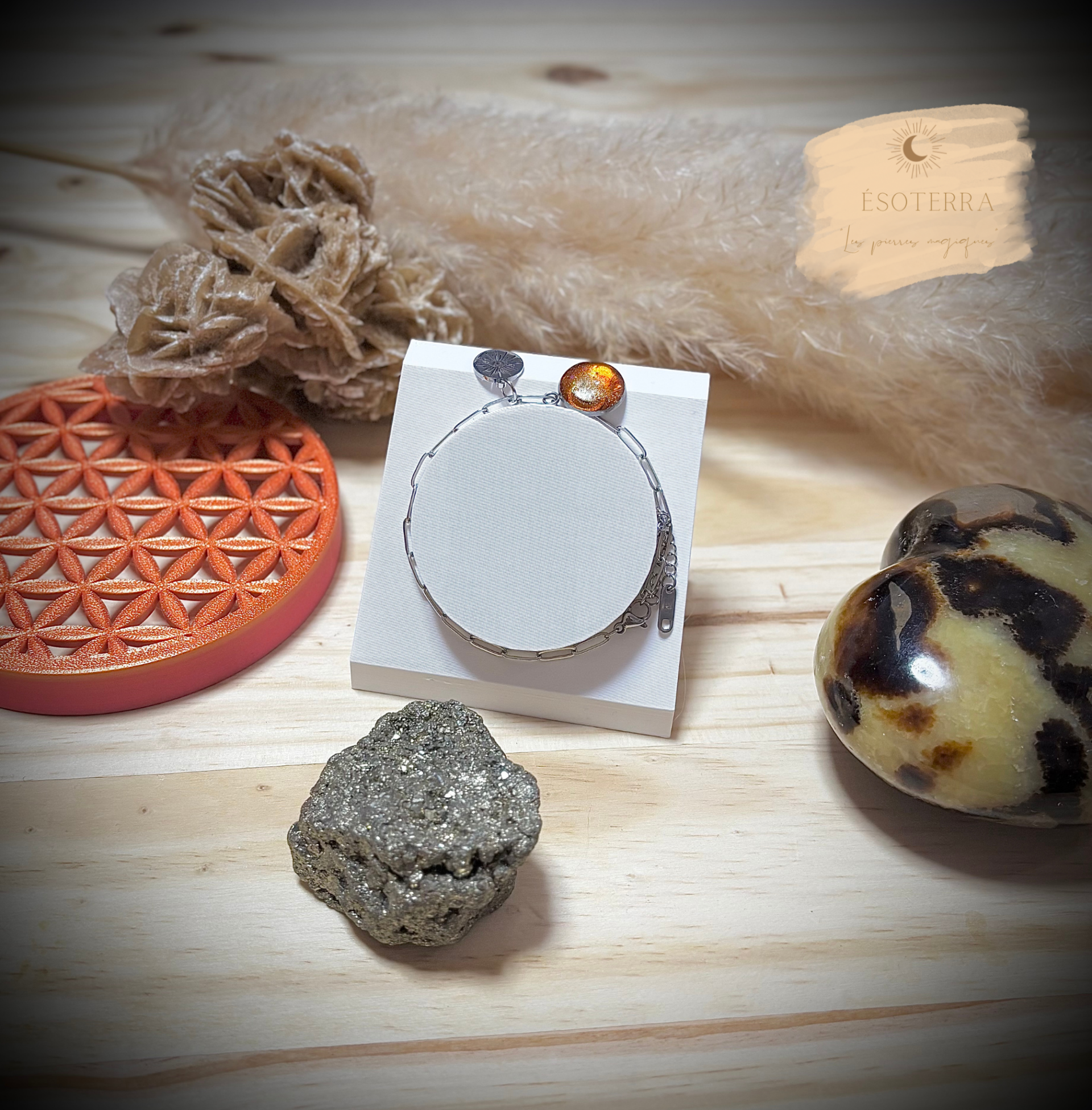Dans LE BIJOU, vous y trouverez une ou des pierres de "Cornaline", des paillettes, une couleur translucide, des fleurs séchées ou objets miniatures si la place le permet, tout cela associés au chakra correspondant au bijou.