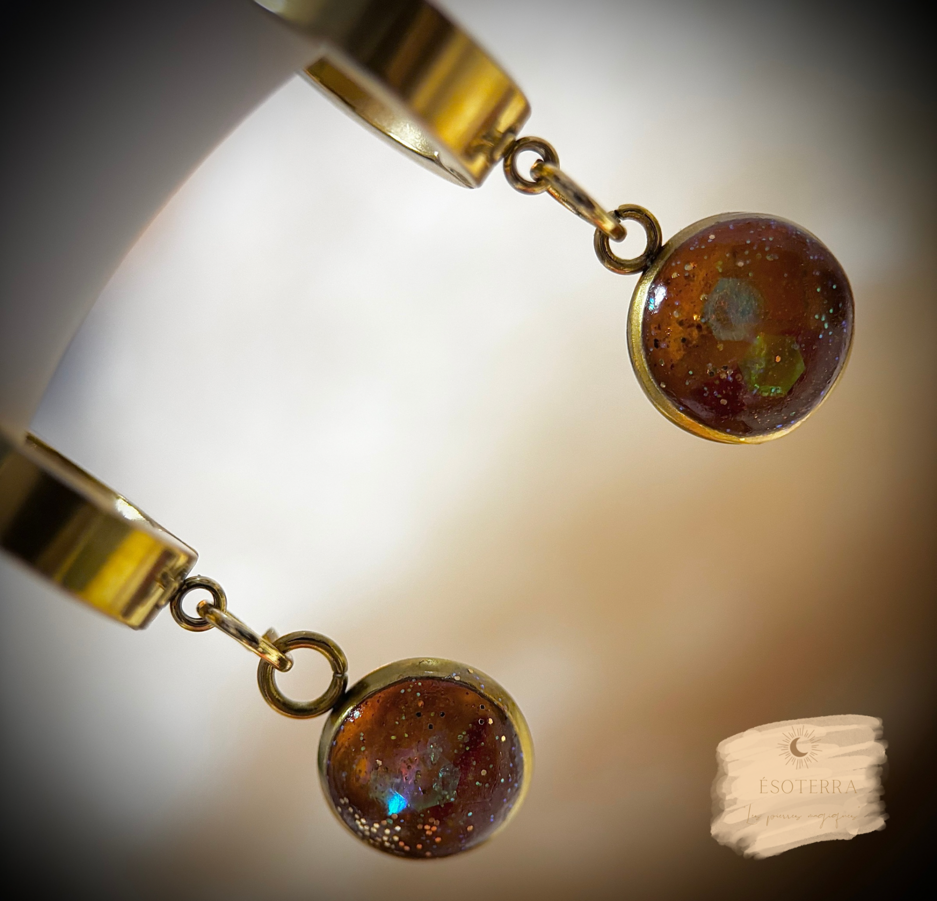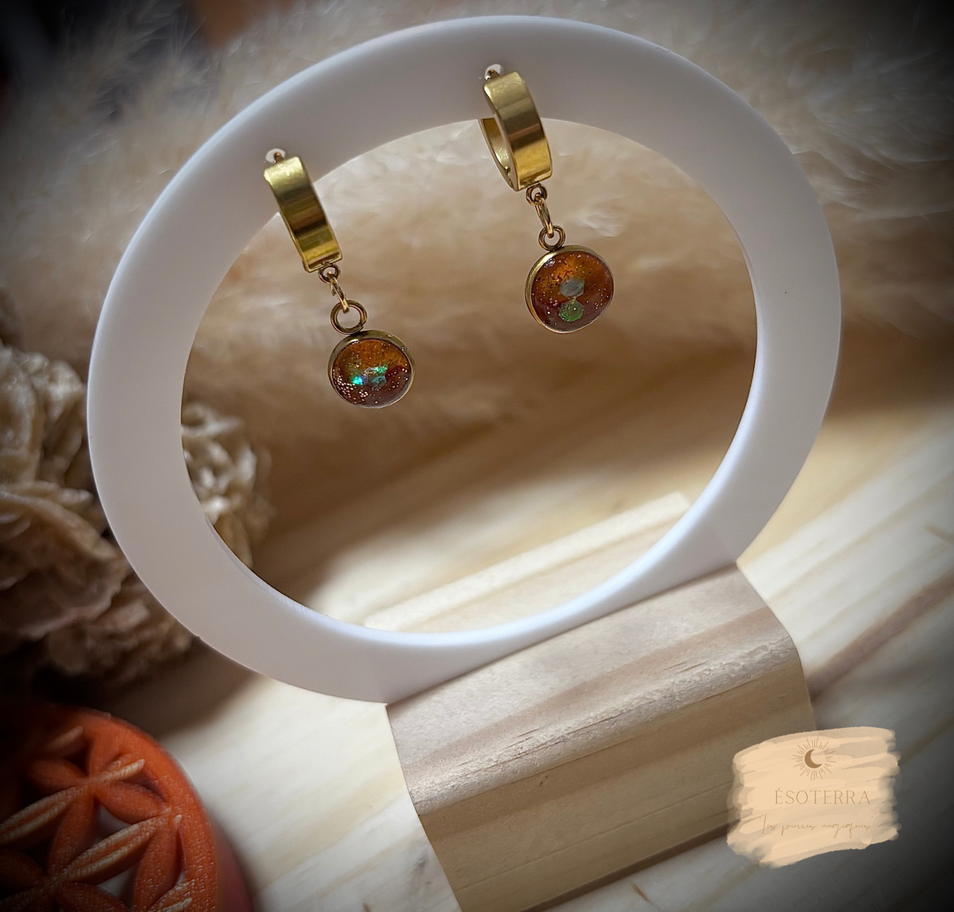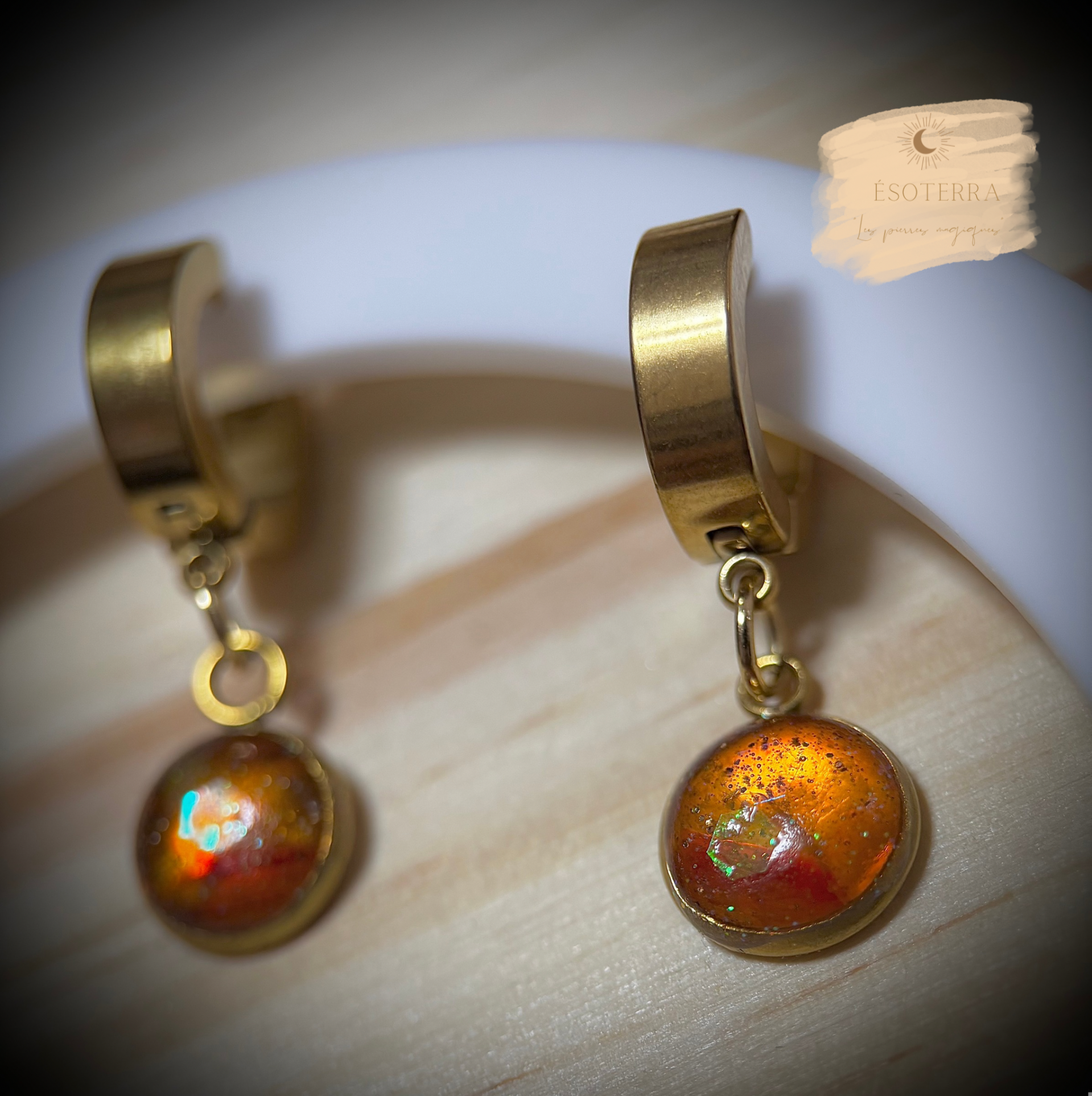 Boucles d'oreilles fait main en résine Epoxy avec créoles couleur Dorée en Acier inoxydable.