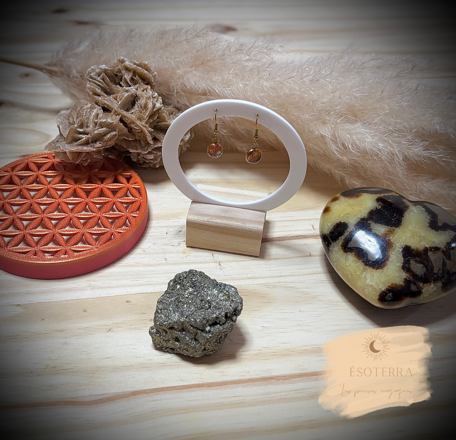 Dans LE BIJOU, vous y trouverez une ou des pierres de "Cornaline", des paillettes, une couleur translucide, des fleurs séchées ou objets miniatures si la place le permet, tout cela associés au chakra correspondant au bijou.